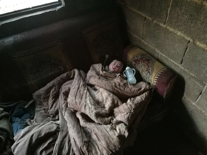 沒(méi)來(lái)得及洗?我的天哪,這衣服還能穿嗎!當時(shí)我心里這樣想。這已經(jīng)不能稱(chēng)之為衣服,用破布來(lái)形容似乎更加恰當,城市里丟棄的衣服都比這個(gè)要好百倍千倍。5個(gè)月大的女?huà)刖吞稍诩抑衅茽€不堪的沙發(fā)上,蓋的被子也是黑黑破破的,她水靈靈的大眼睛看著(zhù)我們這群陌生人,既不哭也不鬧。同行的女隊員不禁落淚,因為她們想象不出竟有這樣困難的家庭,這么可憐的孩子。