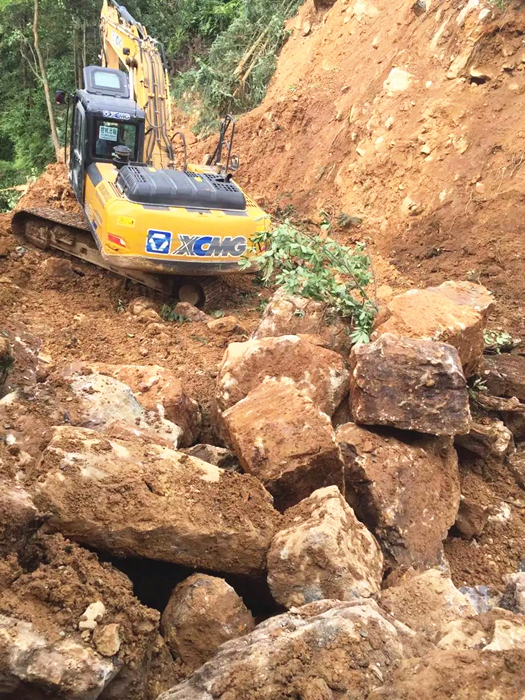 7月13日早7點(diǎn),響徹云霄的鞭炮聲過(guò)后,所有機械開(kāi)始作業(yè)。挖掘機工作7小時(shí)推進(jìn)到6米的時(shí)候,山體出現了滑坡,好在提前做了排險處理,未出現任何施工事故。道路基線(xiàn)均處在滑坡地帶、山體內所含石料60%為整石、40%為孤石含雜松軟黏土,這為施工帶來(lái)了很大難度,工作進(jìn)度也非常緩慢,到了晚上22點(diǎn),道路才勉強推進(jìn)到9米。